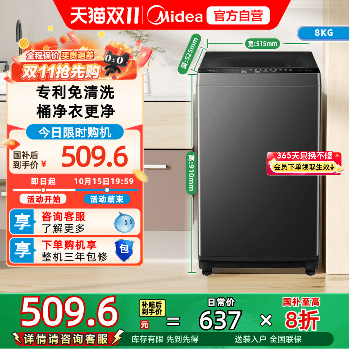 限手机端: Midea 美的 波轮洗衣机全自动家用 MB80V37T 8公斤 509元