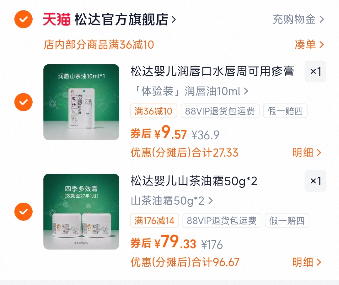 一起加入购物车,整单88.9元,面霜79.33元2瓶,唇膏9.57元/支。