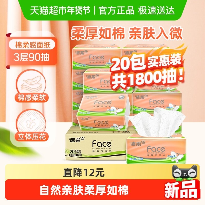 详情页下拉——淘金币大额抵扣:洁柔 粉Face系列 立体压花抽纸 90抽20包 21.92元 (需用券)